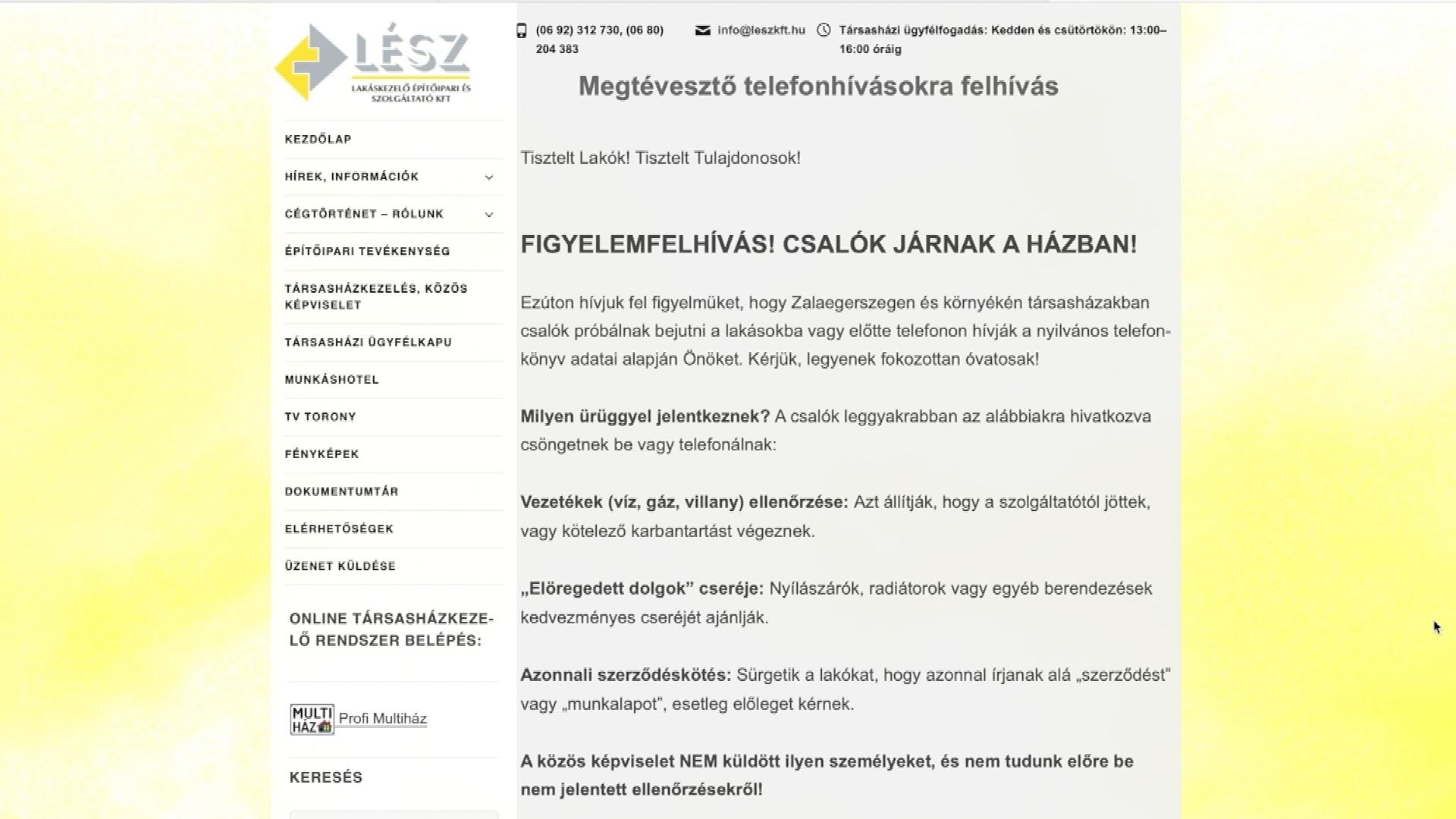 Megkeresték őket azzal, hogy társasházi felméréseket, illetve a lakásban vezetékeket, villanyvezetékeket, a csőhálózatot szeretnének felmérni, mert ezek rossz állapotban vannak. Ezzel kapcsolatban szeretnének aláíratni szerződést, valamint készpénzes előleget kérnének. A közös képviselet és a közös képviselők sohasem dolgoznak készpénzes szerelőkkel, és különösen nem az ilyen házzal kapcsolatos felújításokban. Ezért arra kérünk mindenkit, hogyha valaki gyanakszik, akkor először a közös képviselőt kérdezze meg, hogy van-e ilyen felmérés a házban