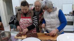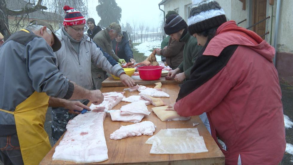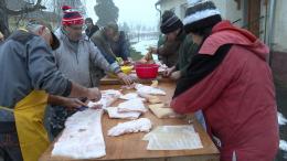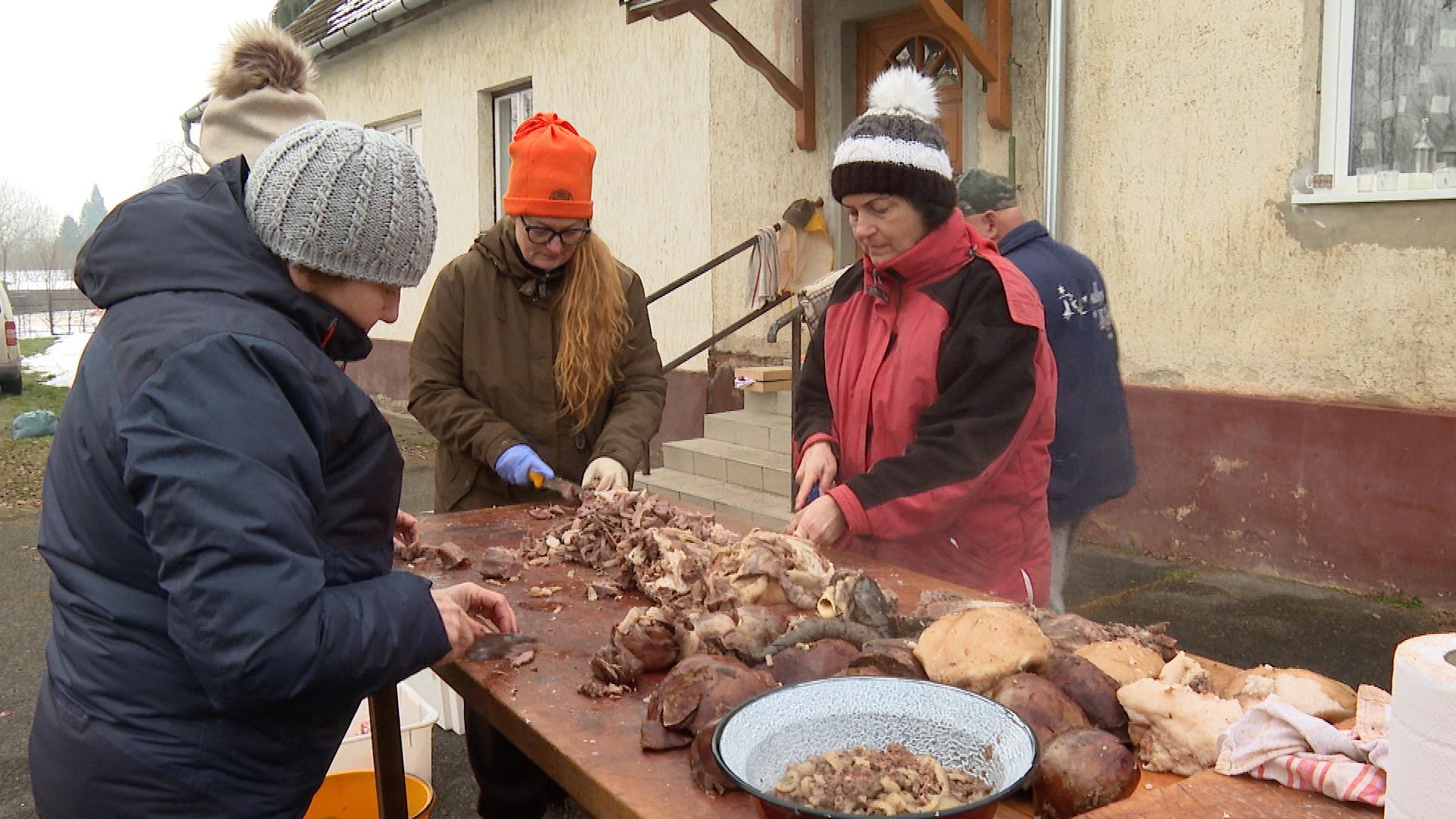 A településrész közösségi házánál már szombaton kora reggel megkezdődtek a munkálatok. Az udvaron a hús feldolgozásával foglalkoztak, a konyhában pedig a háziasszonyok gondoskodtak a finom falatokról. A hurka és a kolbász mellett sült hús is került az asztalokra.
