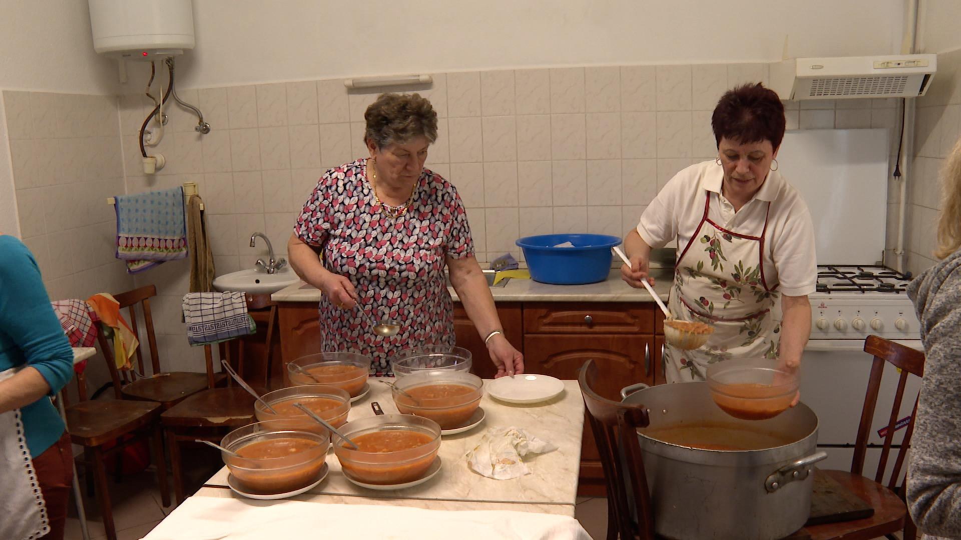 A tányérokon közel 200 szalagos díszelgett, ami 8 kg lisztből készült. A konyhai műveleteket már korán megkezdték, idén egy férfi is csatlakozott a hölgytársasághoz. Ő az előkészületekben, többek között a tészta dagasztásban segédkezett.