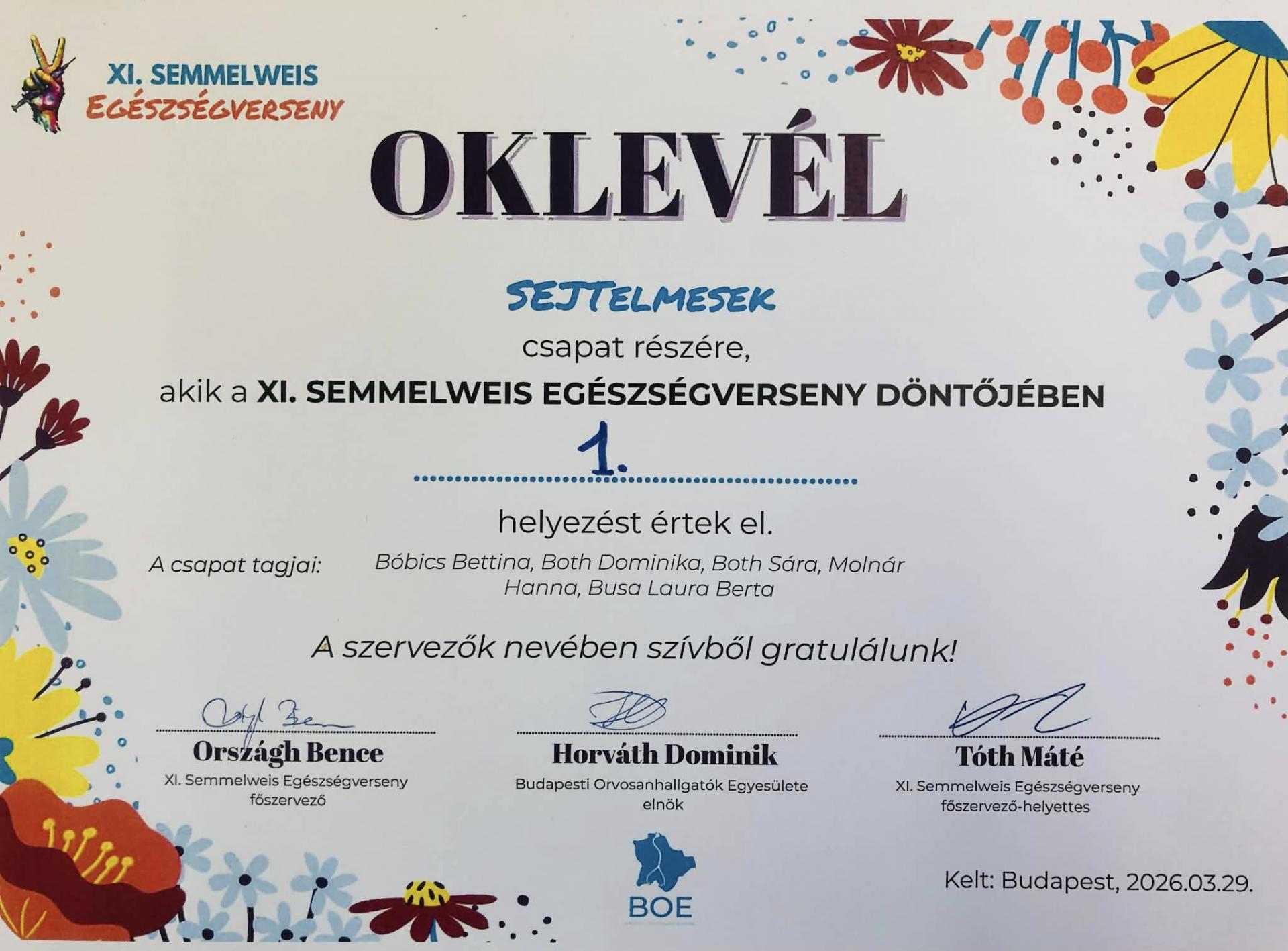 A SEJTelmesek csapata – Bóbics Bettina (12.K), Both Dominika (11.B), Both Sára (11.B), Busa Laura Berta (11.B) és Molnár Hanna (11.F) – országos első helyezést ért el, amellyel 25 felvételi pontot is szereztek. Emellett a legjobb projektmunkáért járó különdíjat is átvehették.
