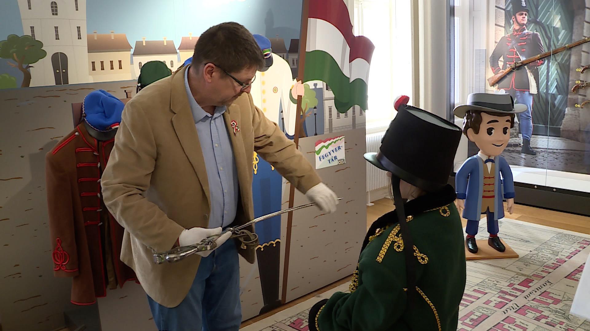 A '48-as, '49-es fegyvereket mutatjuk be a gyerekeknek, amelyet a múzeumnak a fegyverraktárából hoztunk ki és ezeket lehet itt felügyelet mellett kézbe fogni és megnézni a súlyukat