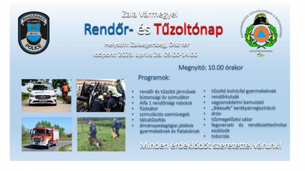 A Zala Vármegyei Katasztrófavédelmi Igazgatóság a rendőrséggel közösen 2023. április 28-án, pénteken járműbemutatóval, füstsátorral és gyermekeknek szóló programokkal várja az érdeklődőket a zalaegerszegi Dísz téren, az Országos Rendőr- és Tűzoltónap alkalmából.