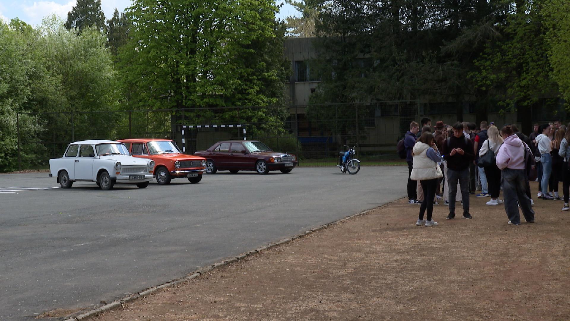 A résztvevők az udvaron veterán járműveket tanulmányoztak. Ezekből az iskola egykori tanulója is rendelkezésre bocsátott néhányat.