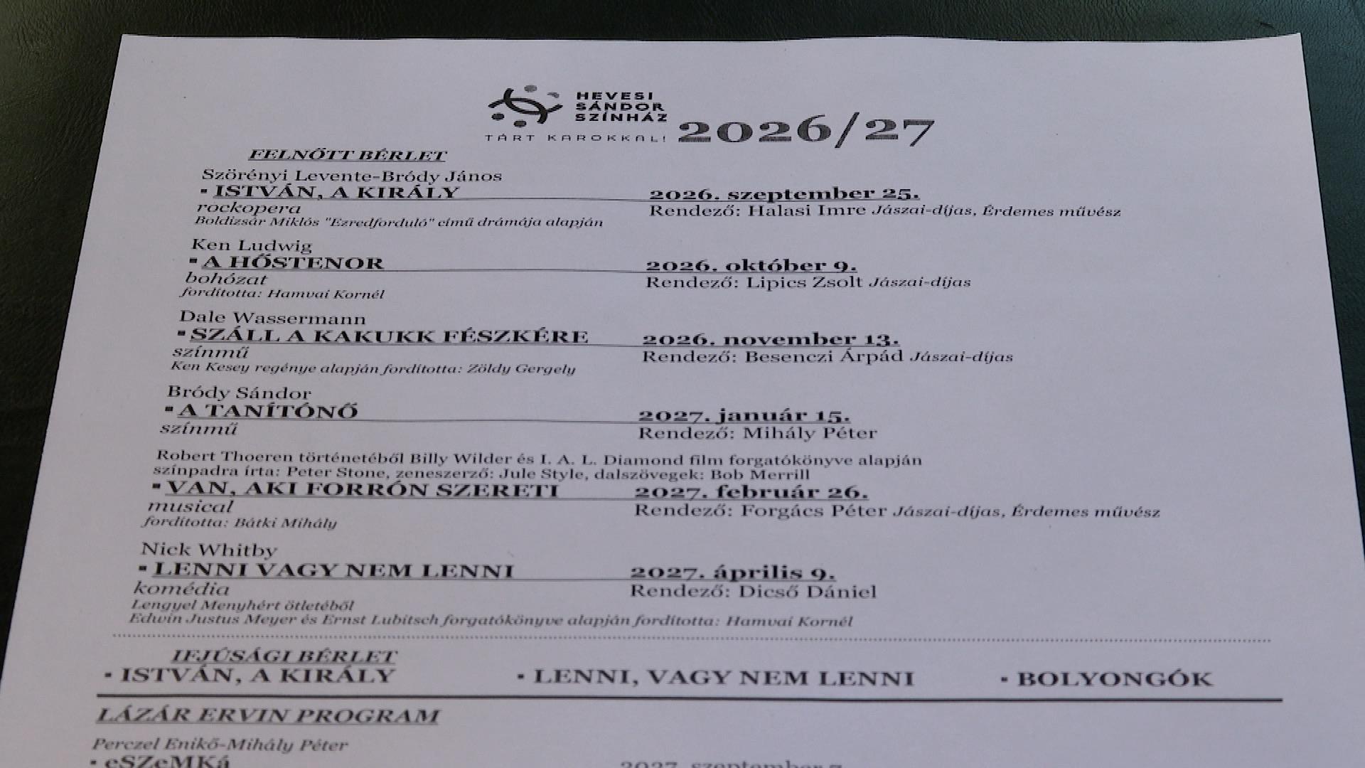 Az évad szeptember 25-én az István, a király című rockoperával indul, melyet egy bohózat: a Hőstenor, majd a Száll a kakukk fészkére követ. A klasszikusok közül 2027. januárjában Bródy Sándor Tanítónőjét viszik színpadra, emellett a Van, aki forrón szereti című musicalt, és a Lenni, vagy nem lenni komédiát is megtekintheti a közönség – jelentette be Besenczi Árpád, a Hevesi Sándor Színház igazgatója.