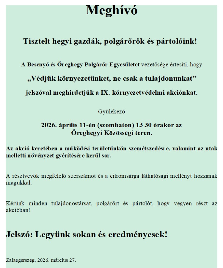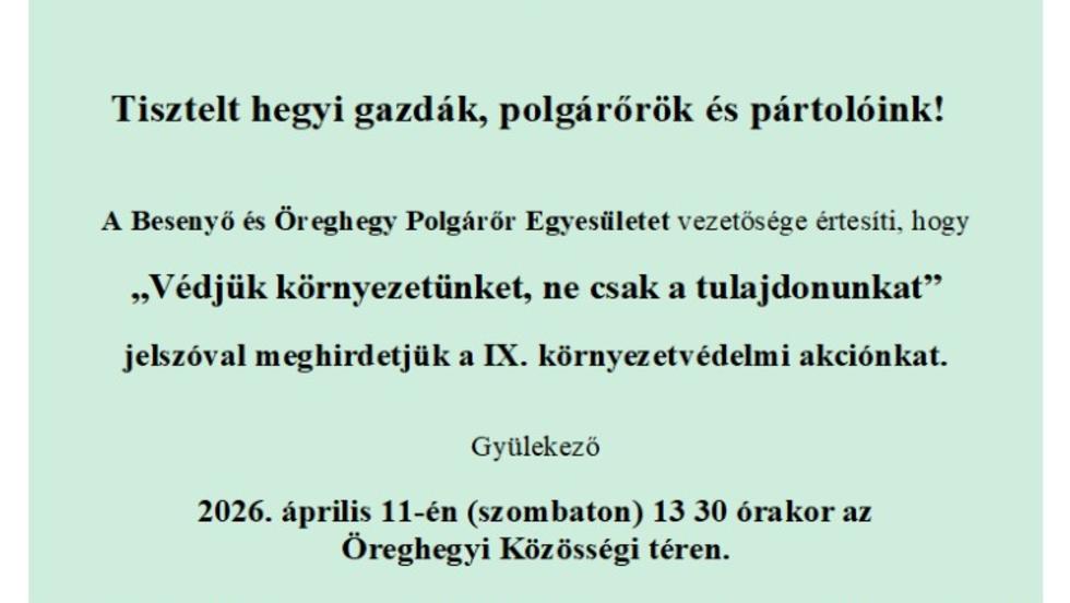 Környezetvédelmi akciót hirdet a Besenyő és Öreghegy Polgárőr Egyesület. A programra április 11-én, szombaton 13:30-tól várják az önkénteseket az Öreghegyi Közösségi téren.