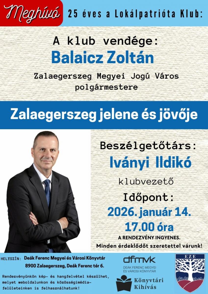 A Lokálpatrióta Klub vendége ezúttal Balaicz Zoltán, Zalaegerszeg Megyei Jogú Város polgármestere lesz.